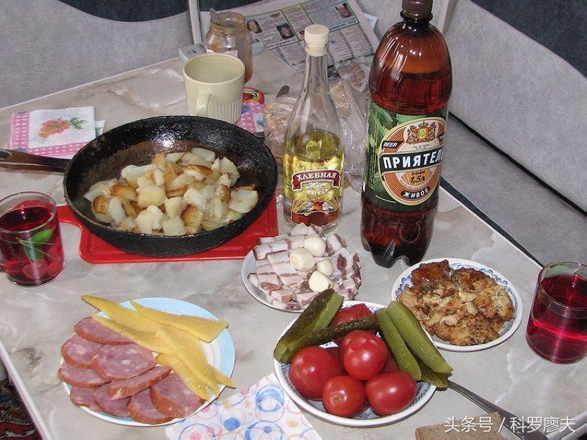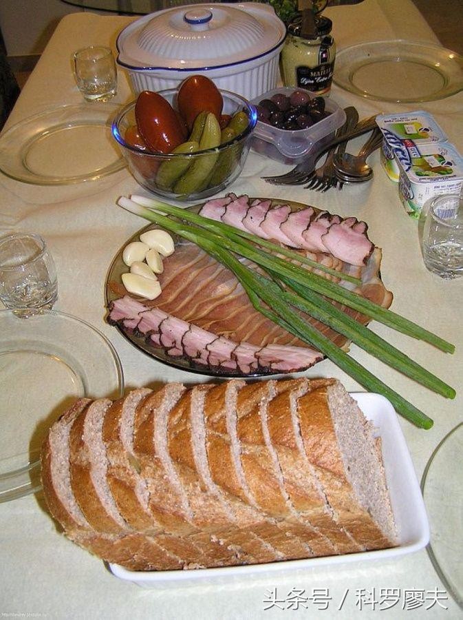 由于生存环境恶劣,俄国人的饮食粗糙狂放,面包是黑的,食物是冷的,黄瓜是酸的,肥肉是生的,海鱼是腥的,白酒是论升喝的。俄国人乐在其中,认为这就是大餐,是无与伦比的美食。按中国人的口味、烹饪风格和美食标准,这些都得扔。
