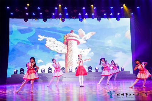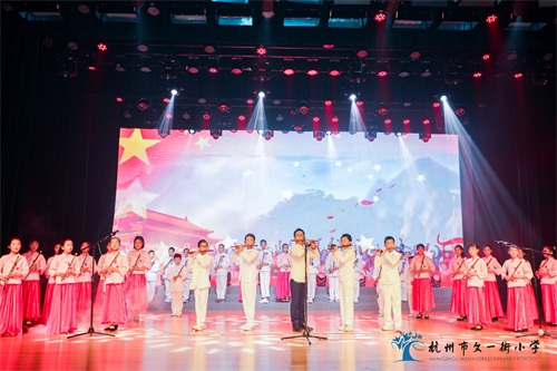 文一校区合唱社团和舞蹈社团联合表演的《我仰望五星红旗》,孩子们用饱满的热情和衷心的热爱,唱出对祖国、对党的崇敬与眷恋,讴歌中华复兴伟业,唱响奋进新时代之声。秀水校区的竹笛演奏《爱我中华》,孩子们用竹笛吹奏轻灵明媚的乐曲,共诉对伟大祖国的衷心依恋和真诚歌颂。