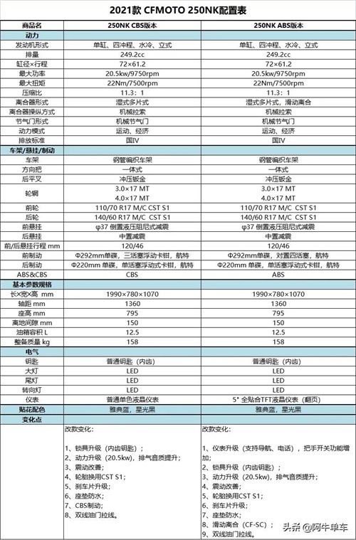2021款春风250NK对车锁内齿进行了改进、轮胎也被换上正新CST S1、刹车片性能、座垫防水性都进行了调整优化,双油门拉线也让整车动力更加细腻。同时车辆震动,排气管音质也同样得到优化升级。挡位传感器由单触点改为双触点,这对于老款车型换挡卡顿也有不小的提升。