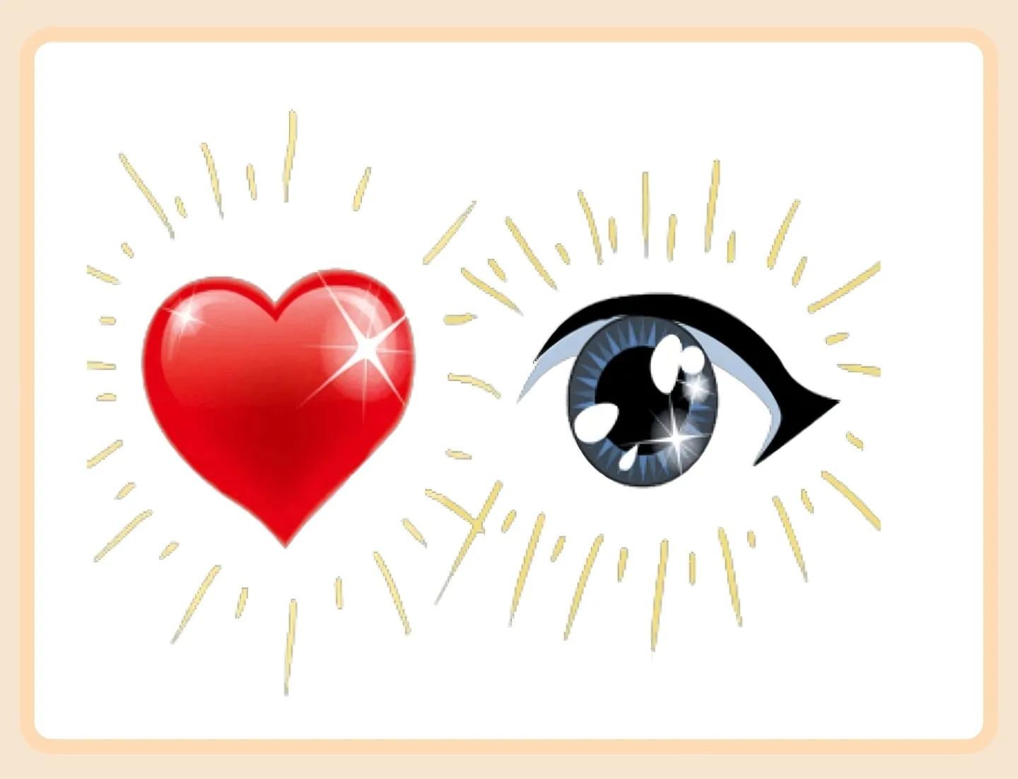 左边是一颗鲜艳的红心,右边是一只漂亮的大眼睛,它们都在闪耀着美丽的光芒。