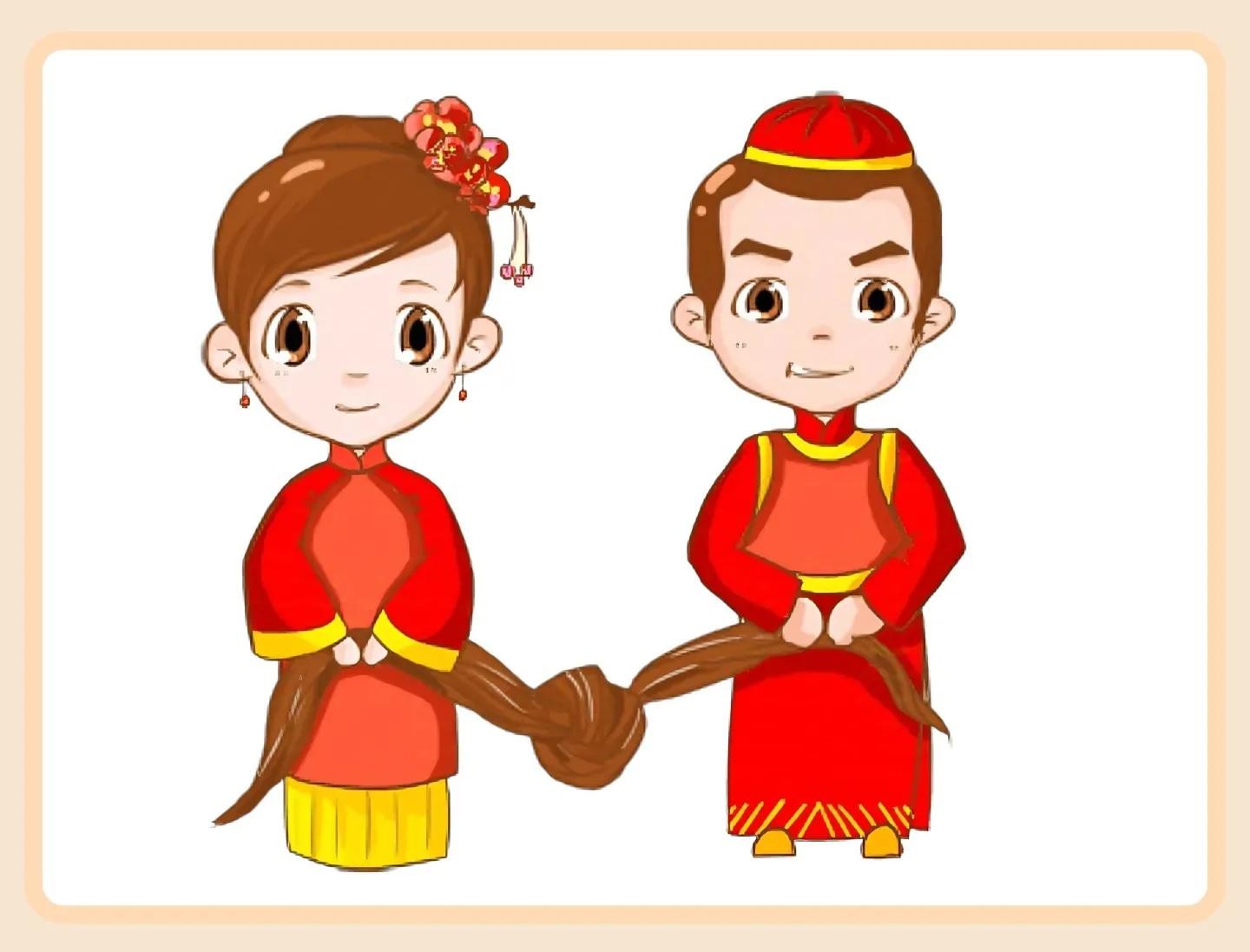 这是一对正在举行婚礼的新人,他们定定地站着,各自拿着绣球的一端,是准备开始拜堂了吗?