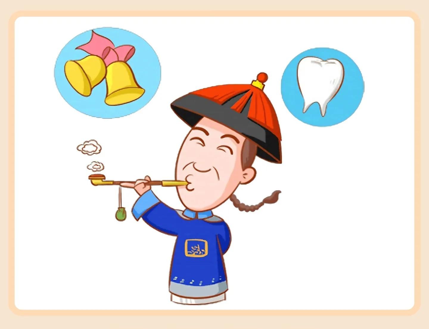 一个清代士兵正在非常享受地抽着烟斗,他的左上方有一个蓝色的圆圈,圆圈里有一双铃铛。右上方也有一个蓝色的圆圈,这个圆圈里有一颗大白牙。