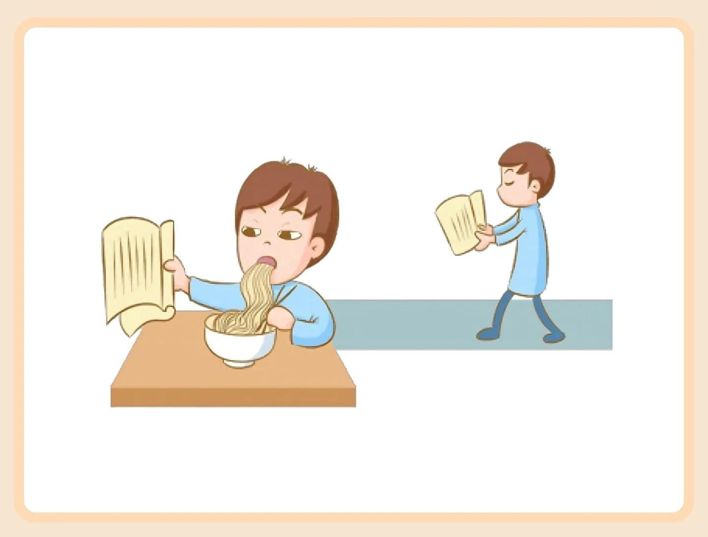 吃饭看书,走路也在看书,这小男孩真勤奋呀!无时无刻不在学习。