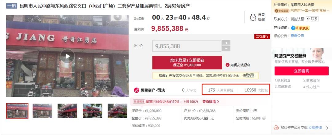 此次拍卖,将从8月4日10时至8月5日10时止,竞价周期为1天。截至8月4日下午三点,桥香园金马碧鸡店拍卖房产被围观5996次,报名人数为零,桥香园小西门店拍卖房产被围观11276次,报名人数也为零。拍卖信息显示,这两处房产都由蒙自市人民法院进行拍卖。