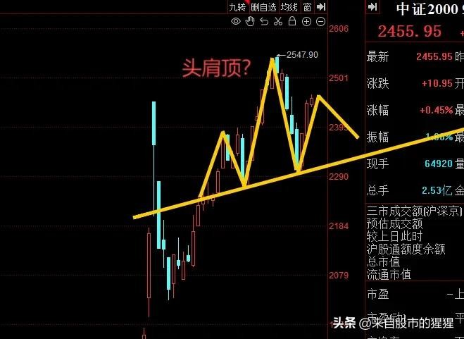 第三,最近两天市场表现的比较火的小盘题材个股,我认为短线已经拉升到位。尤其是代表小盘个股走势的中证2000指数。我认为目前具有潜在的头肩顶的可能性。大家请看下图——中证2000日k线图。