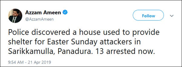 英国广播公司(BBC)驻科伦坡记者阿扎姆·阿米恩(Azzam Ameen)发布推特称,当地警方在斯里兰卡的帕纳杜拉(Panadura)发现了一个为袭击者提供庇护的住宅。