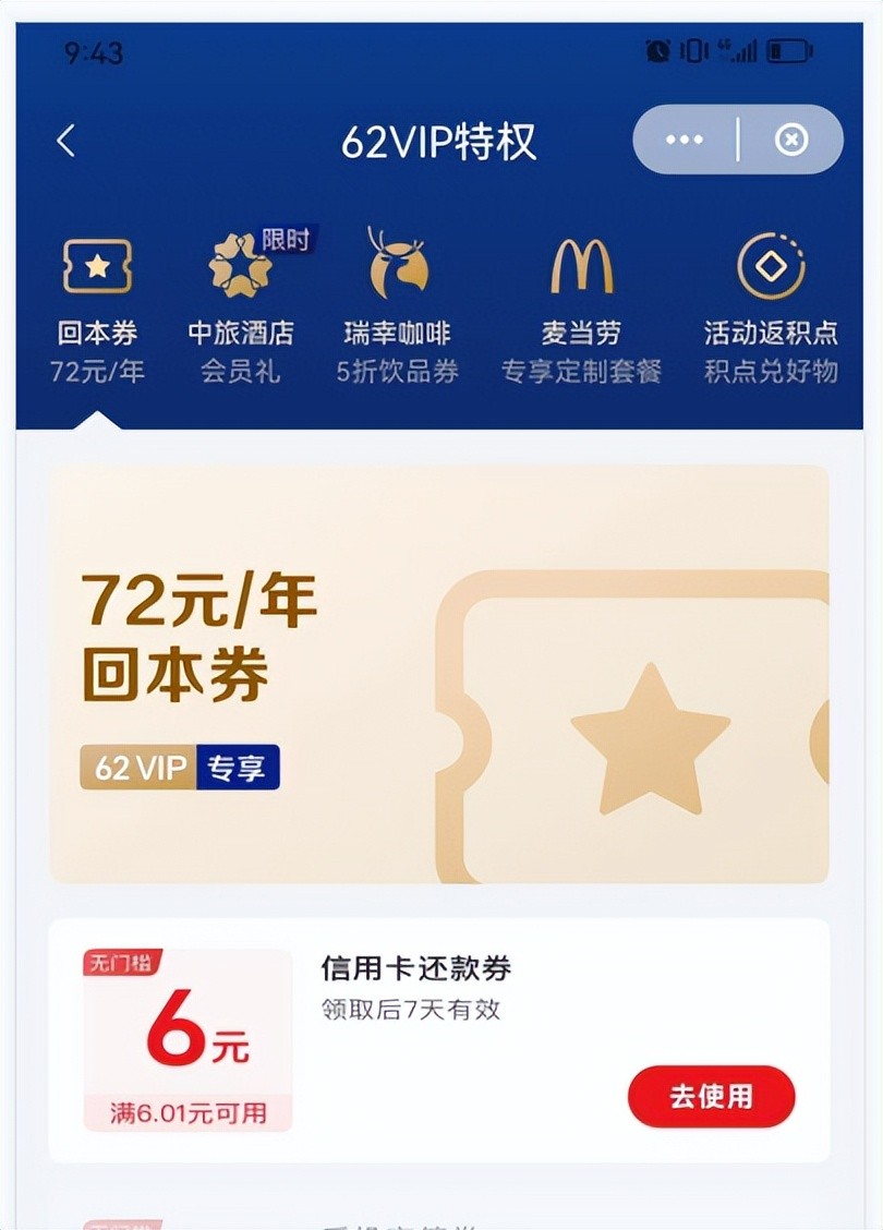 第四步,使用信用卡还款券还款,无门槛每月可以直接抵扣6元,全年可抵扣72元。