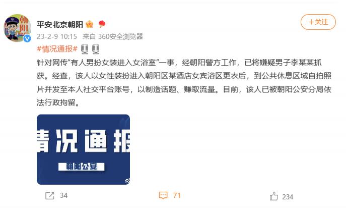 根据北京朝阳警方的通报,针对网传 " 有人男扮女装进入女浴室 " 一事,经朝阳警方工作,已将嫌疑男子李某某抓获。经查,该人以女性装扮进入朝阳区某酒店女宾浴区更衣后,到公共休息区域自拍照片并发至本人社交平台账号,以制造话题、赚取流量。目前,该人已被朝阳公安分局依法行政拘留。