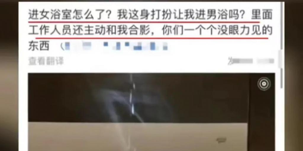 近日,网传在北京 " 有人男扮女装进入女浴室 "。网传的分享界面显示,该男子自拍后还表示 " 进女浴室怎么了 "。