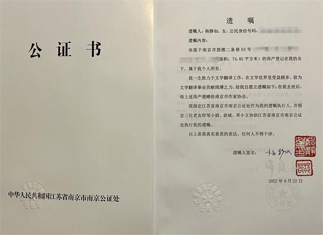 现代快报讯(记者 郑文静)记者从杨苡先生儿子赵苏处获悉,著名翻译家、作家、" 呼啸山庄 " 译名首创者杨苡曾于 2022 年 9 月 22 日立下遗嘱,将自己位于南京市鼓楼二条巷 53 号的一套面积 74.82 平方米的个人房产遗赠给南京市作协,并指定南京市南京公证处作为遗嘱执行人。