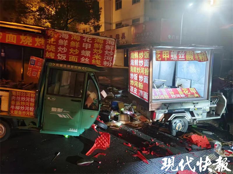 当日凌晨 4 点 10 分,交警姜堰大队城区一中队接到群众报警,在北大街联通公司营业厅门口有人开车把路边夜市摊点给撞翻了。接到报警后,民警迅速赶往现场,看到事发现场一片狼藉,被撞坏的两辆三轮车变形,小吃摊的食品、餐盒、筷子等散落一地,一名女摊主受伤。