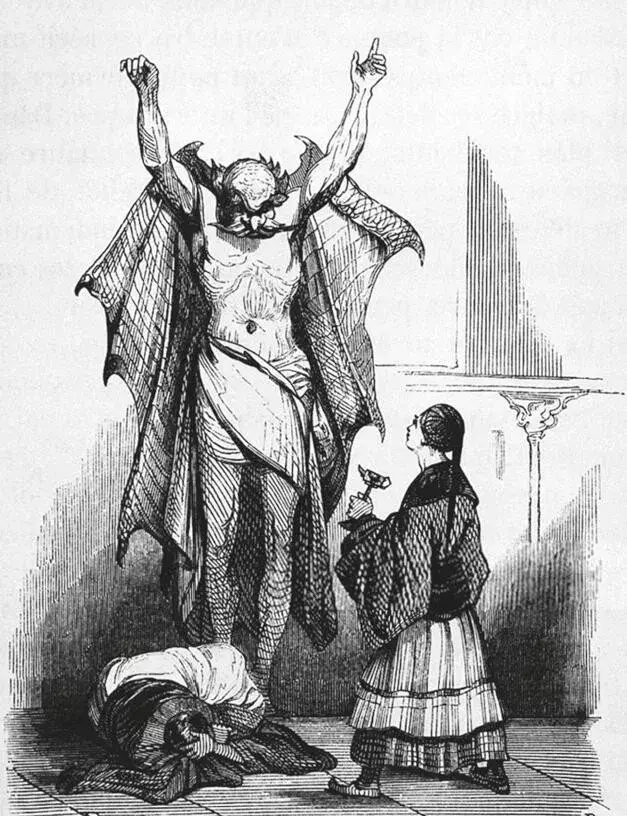 《一千零一夜》插图,描绘邪恶的魔法师来到阿拉丁家前