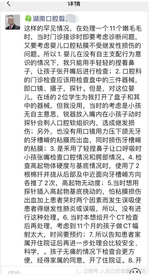 9 月 12 日,翦医生再次在朋友圈发布了回应," 我把我当时为什么没有直接用口腔探针去从这个物体底部挠动,是怕造成婴儿口腔粘膜的继发性损伤,如果一个 11 个月的孩子出现窒吸门诊没有处理条件,而改用 2 根棉扦并扰探试物体硬度和基底的宽度后,而争得患者父母同意开住院证入院进一步处理。"
