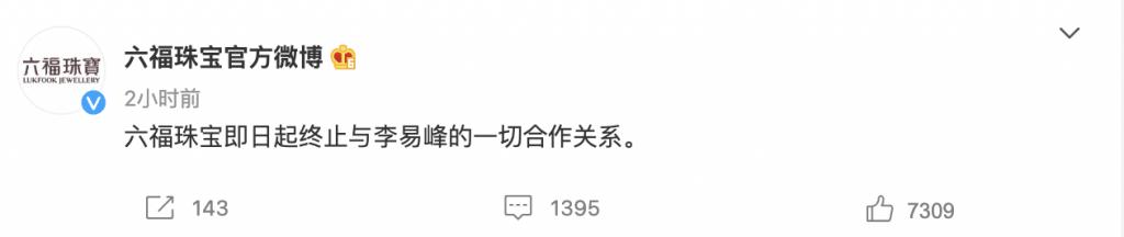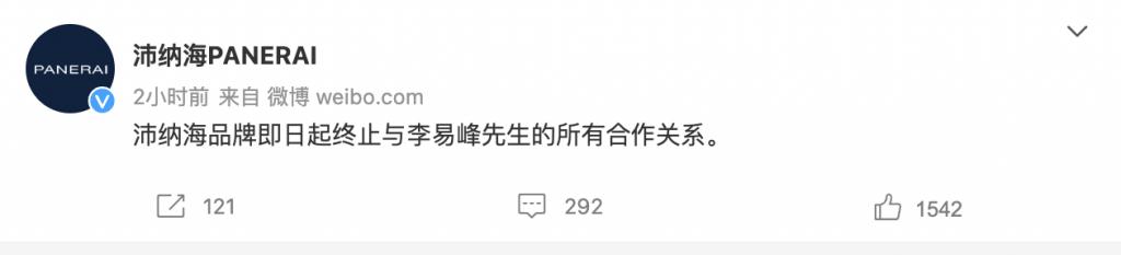 李易峰嫖娼的消息爆出后,各商业品牌方也反应迅速,截止目前,蒙牛真果粒、京都念慈菴、HONMA 高尔夫、PRADA、沛纳海、六福珠宝等品牌,相继通过官方微博发布声明称,与李易峰终止品牌合作关系。