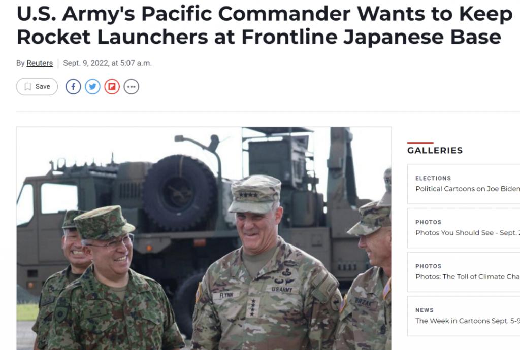 以 " 东海有事 " 和 " 台海有事 " 为假想场景展开的美日联合军演 " 东方之盾 2022" 结束了。而美国陆军太平洋地区司令弗林 9 月 9 日表示,即便军演已经结束,他也不急于将在军演中使用过的 " 海马斯 " 和其他武器装备从位于中国东海边缘的日本陆上自卫队基地撤走。