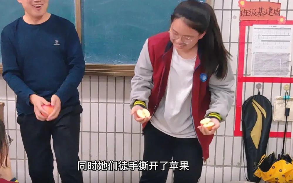 △刘华东老师指导学生利用杠杆原理“手撕苹果”。