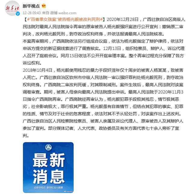 此案引起全国人民的关注,一审杨光毅被判死刑,然而在二审时被改判死缓,法院宣判一出,网络上瞬间炸锅,网友纷纷发言要求重审,被害人母亲也对最高人民法院进行了上诉。这个案件的审判持续了两年,直至今日终于广西高院再审对原告宣判了死刑。这个结果不足以消弭掉凶手对受害者以及其家庭造成的伤害,但除此结果之外也没有更好的判决能够慰藉小女孩的在天之灵了。愿天堂没有黑暗。
