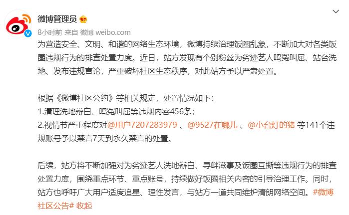 为营造安全、文明、和谐的网络生态环境,微博持续治理饭圈乱象,不断加大对各类饭圈违规行为的排查处置力度。近日,站方发现有个别粉丝为劣迹艺人鸣冤叫屈、站台洗地、发布违规言论,严重破坏社区生态秩序,对此站方予以严肃处置。