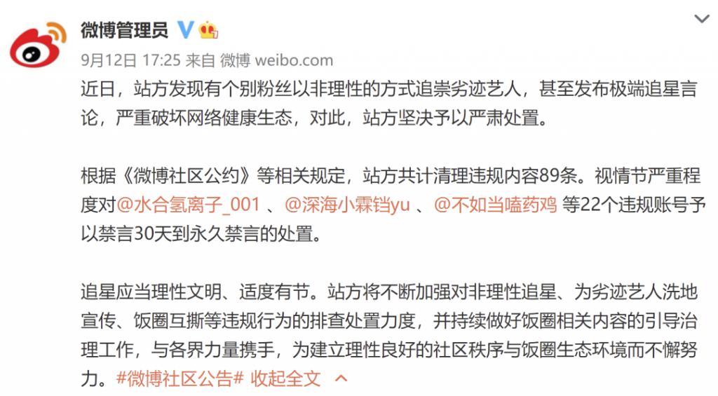 此前一天的 12 日,微博就处置了一批发布极端追星言论的用户: