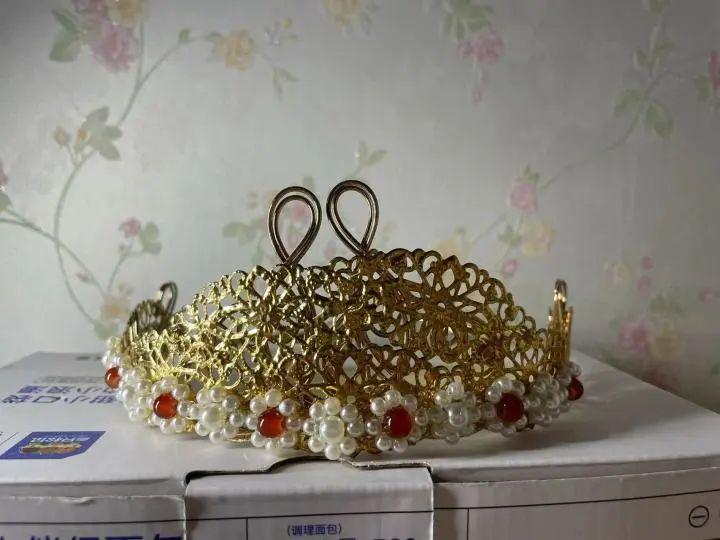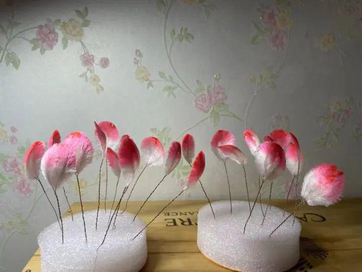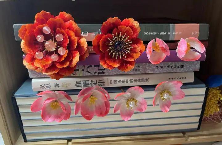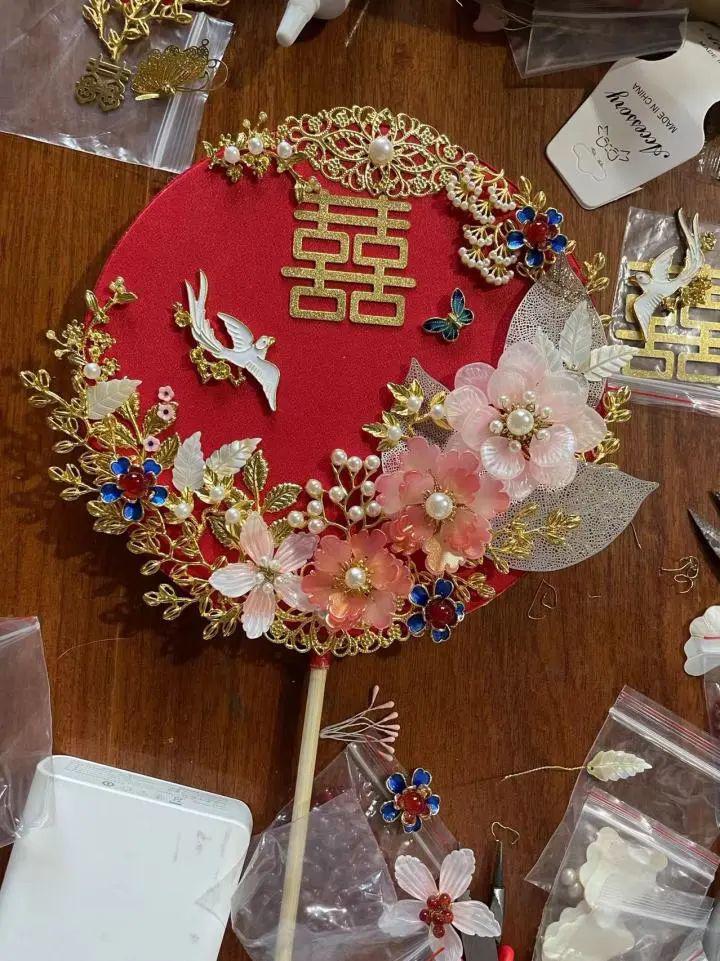 " 刷了很多视频,一眼就相中了一款绒花婚冠,觉得很美。小李也很喜欢。不过市场上卖的不是不够好看,就是价格很高。当时也没多想,就觉得要让小李漂漂亮亮地出嫁,所以我决定给她做一顶婚冠。"