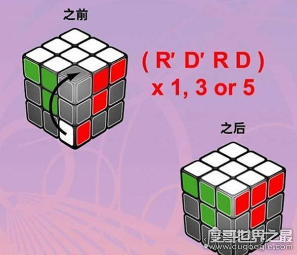 第三步:将中间层归位,把白色面转向下,找出红绿边块,按照顺时针的方向转动顶层,直到与图上的情况相同。