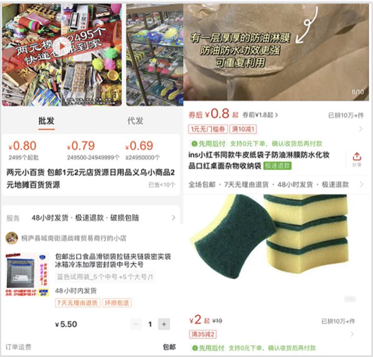 在拼多多、抖音商城里有很多这些 1 元、2 元、5 元的小商品,基本上都是从义乌、桐庐发出的