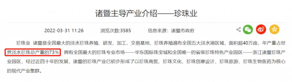 浙江诸暨市贡献了世界淡水珍珠总产量的 73%