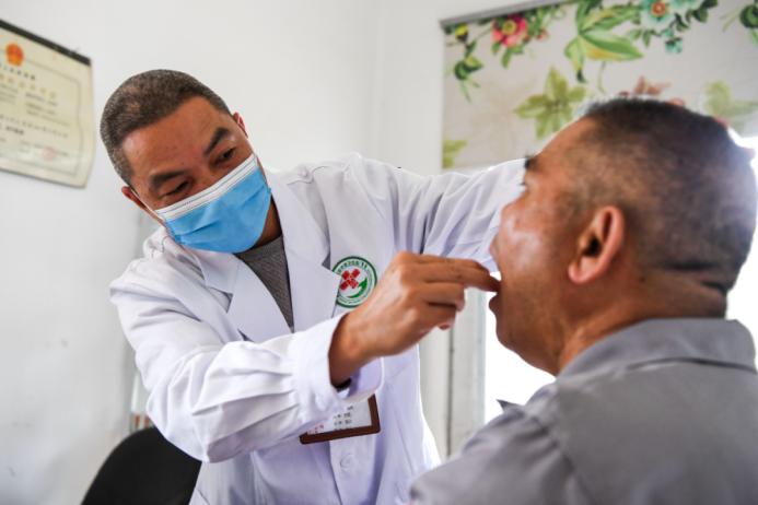 ▲ 2021 年 11 月 3 日,在广西崇左大新县下雷镇仁爱村,乡村医生赵建柏为村民检查口腔。新华社记者 曹祎铭 摄