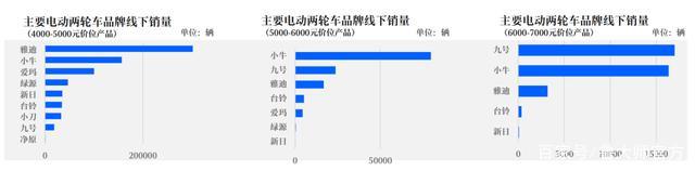 高端市场层面,雅迪竞争者中,小牛、九号等多个品牌都在争抢这块美味的 " 蛋糕 "。据《鲁大师 2021 年电动两轮车行业调研报告》显示,在 5000-6000 元、6000-7000 元高端价格中,九号、小牛销量分别为第一、第二,雅迪仅在 4000-5000 元销量第一,暂未形成突出优势。
