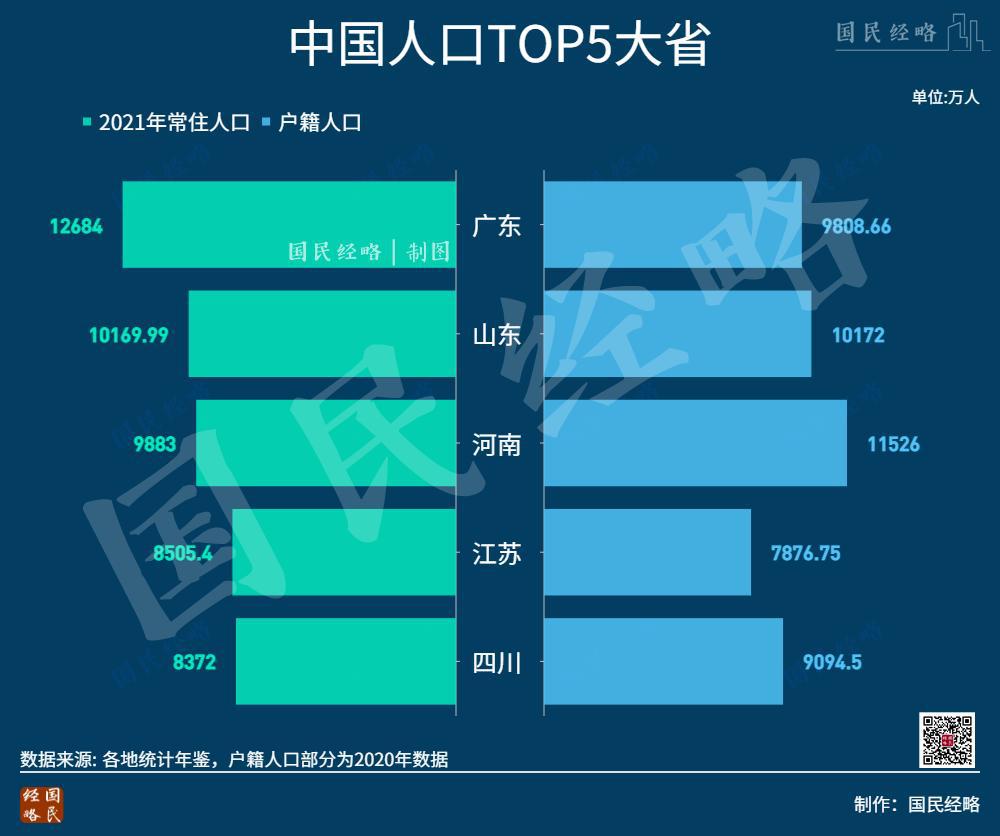 河南户籍人口过亿,而常住人口仅有 9883 万人,不及广东及山东。