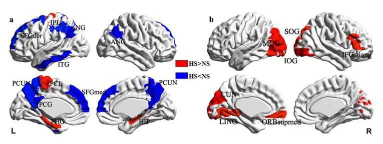 大脑神经网络对比,蓝色部分为不吸烟的人好于重度吸烟者的区域,红色为重度吸烟者好于不吸烟的人的区域。可见除了视觉区域,不吸烟者的多个脑区神经网络效率好于重度吸烟者。图片来源:参考文献 [ 1 ] 。