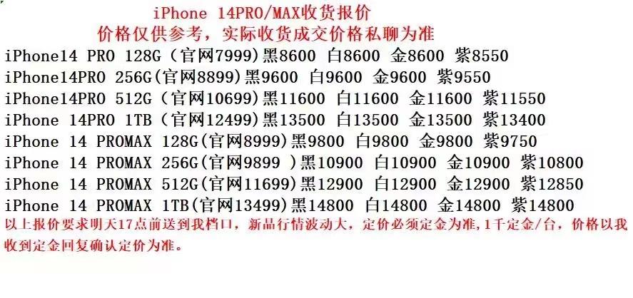 另一位卖家在苹果店门口告诉记者,Pro 回收可以溢价 800 元,Pro Max 溢价 1000 元。随后,他还提供了一份华强北昨晚的报价,称 " 仅供参考 "。
