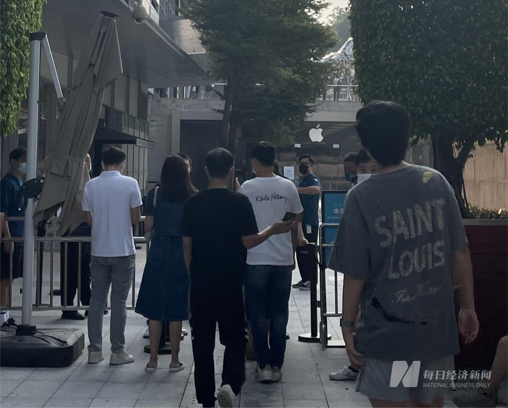 今日(9 月 16 日),三款 iPhone 14 系列机型正式发售(iPhone 14 Plus 将于 10 月 7 日发售)。今天上午 9 点前,《每日经济新闻》记者来到深圳益田假日广场的苹果直营店,现场已经有十几人在排队。