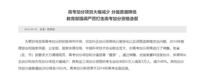 2014 年底,国务院印发《国务院关于深化考试招生制度改革的实施意见》,明确提出 " 大幅减少、严格控制考试加分项目,2015 年起取消体育、艺术等特长生加分项目 "。此前,教育部已经出台了一系列文件,为高考加分政策 " 瘦身 ",大幅减少高考加分项目,降低分值,更是严厉打击高考加分资格造假。
