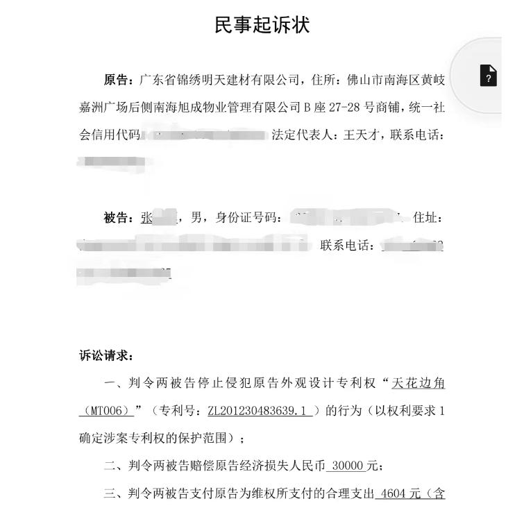 起诉状显示,张先生销售的产品侵犯了 " 装饰过渡连接件 " 和 " 天花边角 " 的外观设计专利权,两张起诉状一共要求赔偿损失 60000 元。晨意帮忙记者注意到,原告系广东省锦绣明天建材有限公司,其委托的知识产权代理公司系长沙市荔龙知识产权代理有限公司。