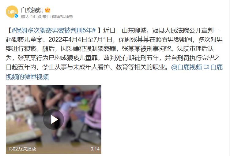 近日,山东聊城冠县人民法院公开宣判一起猥亵儿童案。2022 年 4 月 4 日至 7 月 1 日,保姆张某某在照看男婴期间,多次对男婴进行猥亵。随后,因涉嫌犯强制猥亵罪,张某某被刑事拘留。法院审理后认为,张某某行为已构成猥亵儿童罪,故判处有期徒刑五年,并自刑罚执行完毕之日起五年内,禁止从事与未成年人看护、教育等相关的职业。