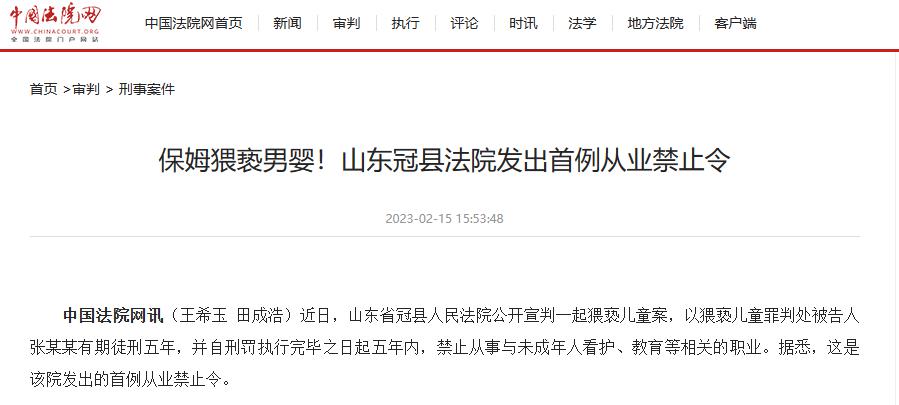 近日,山东省冠县人民法院公开宣判一起猥亵儿童案,以猥亵儿童罪判处被告人张某某有期徒刑五年,并自刑罚执行完毕之日起五年内,禁止从事与未成年人看护、教育等相关的职业。据悉,这是该院发出的首例从业禁止令。