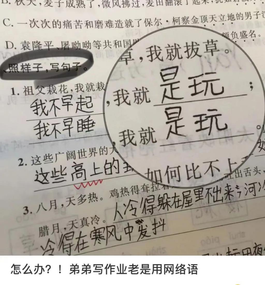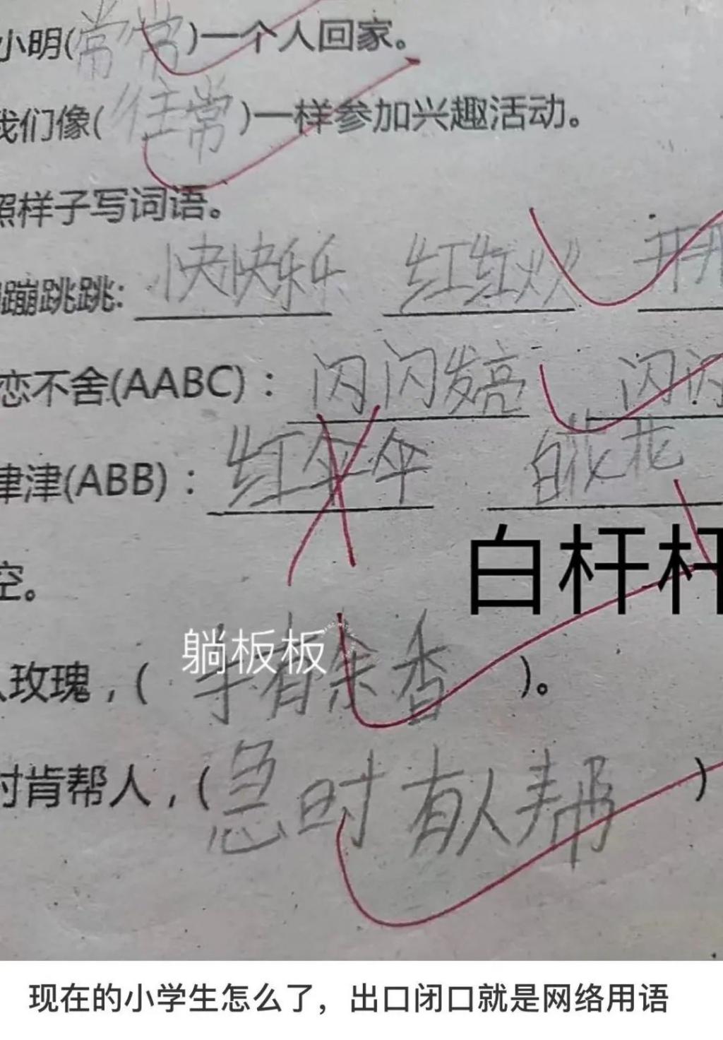 澎致小学语文老师杨帆之前批改作文,就碰到过新闻里类似情况。" 因为是低年级学生,作文用的大多是短句,有孩子就会写‘芭比 Q 了’‘我太难了’,一般会提醒他们换一个说法。"