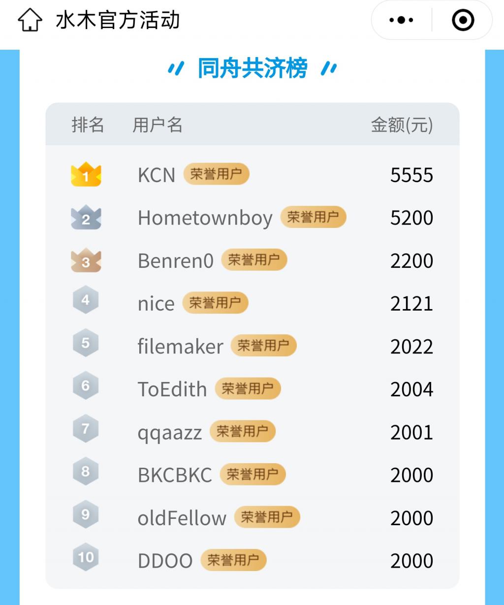 中新经纬在捐款界面看到,大批用户进行了捐款。" 同舟共济榜 " 居首的用户捐赠了 5555 元,第二名也捐赠了 5200 元。