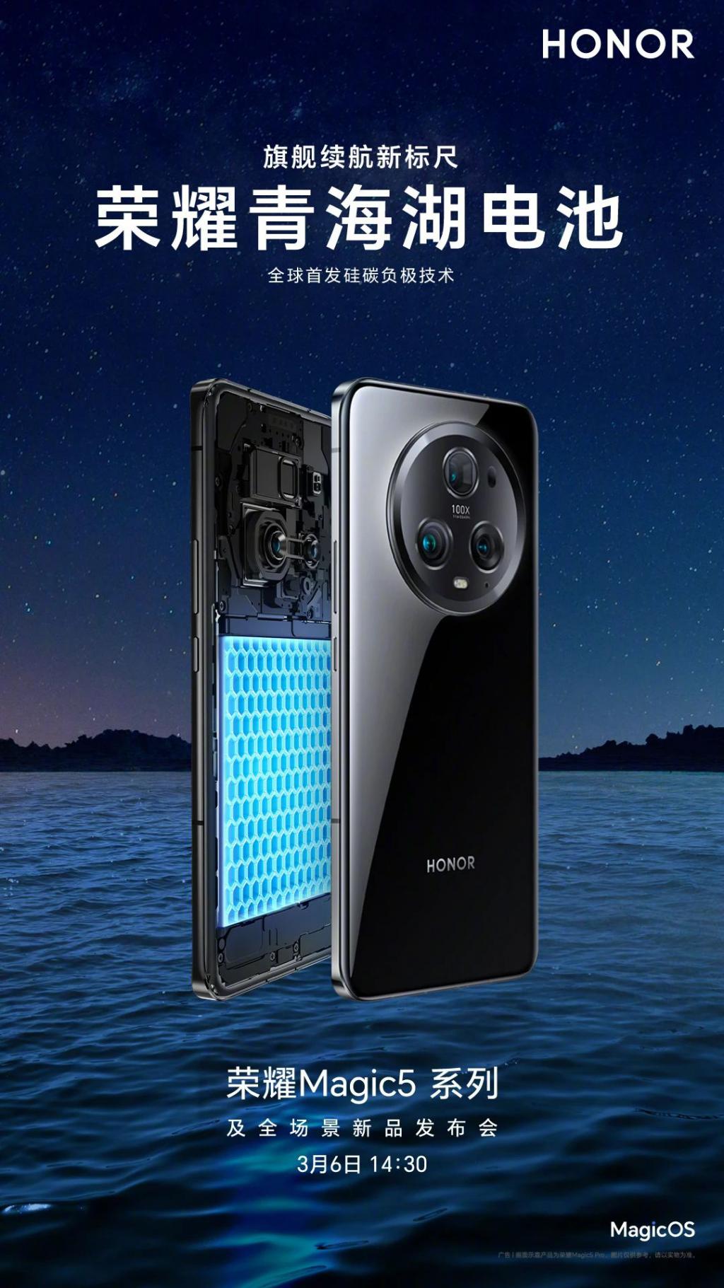 前两天荣耀 Magic5 系列在 MWC 发布时曾宣布全球首发硅碳负极电池技术,相同体积下实现更大电池容量。国行发布会定于 3 月 6 日,今天也预热了进一步消息。