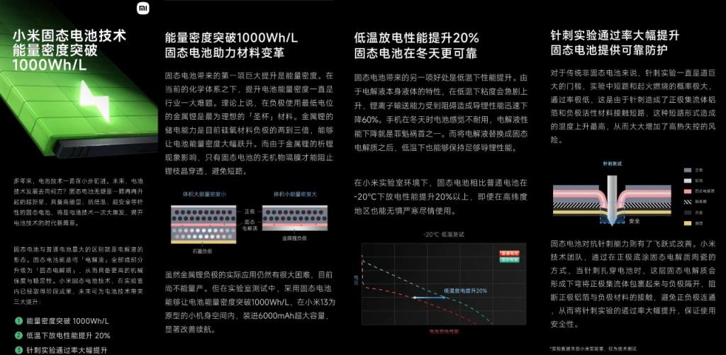 另一边,据小米微博宣布:小米预研固态电池技术,通过将电解液替换为固态电解质,能量密度突破 1000Wh/L,并大幅提升低温放电性能和安全性。