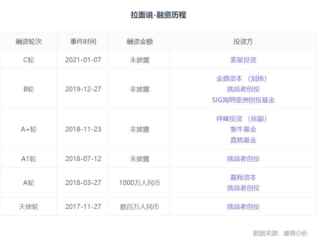 拉面说的快速增长,背后也离不开资本支持。创业邦旗下睿兽分析的数据显示,拉面说至今共完成 6 轮融资。