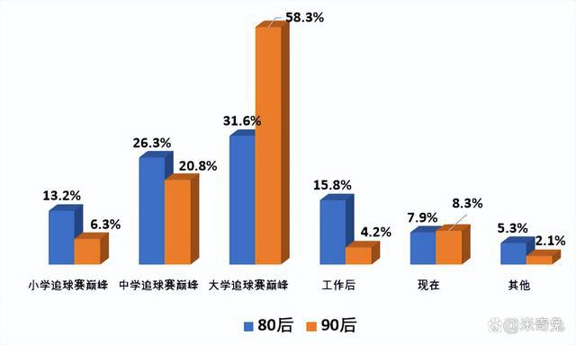 有一项数据特别值得注意,无论是 80 后还是 90 后,都是在大学时迎来自己看球巅峰期。不过有趣的是,在工作之后,80 后迎来看球巅峰期的比例差不多是 90 后的 4 倍。