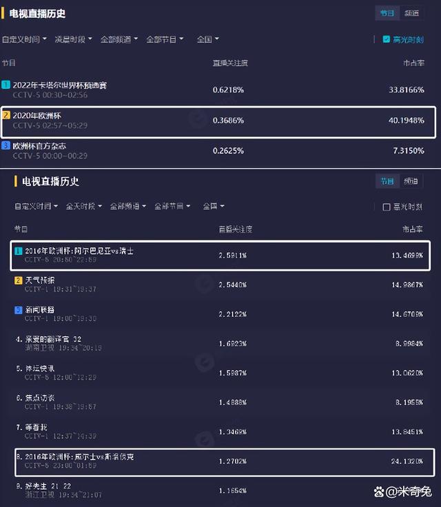从统计数据可以看到,同样是央视五套转播的欧洲杯,2020 年的收视率居然只有 2016 年时的 14%。要知道当时的参照队对象,还是阿尔巴尼亚 vs 瑞士这样的冷门比赛。