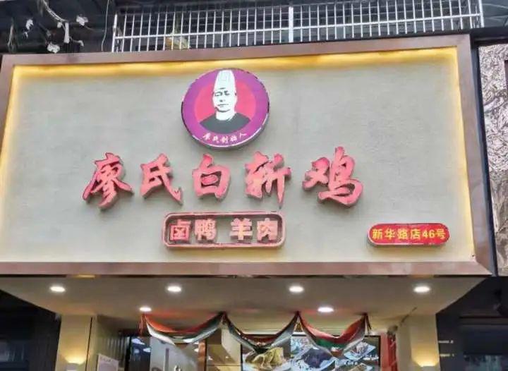 新华路 " 廖氏白斩鸡 " 的招牌上,是一位头戴厨师帽的男性头像,头像下方标有 " 廖氏创始人 " 字样,还标出了店内经营的另外两个品类:卤鸭和羊肉。