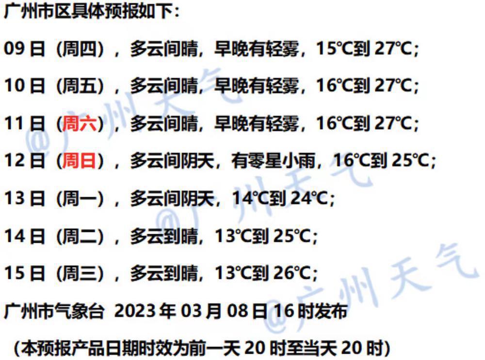 广州市气象台 3 月 8 日预计,广州市区 3 月 12 日转多云间阴天有零星小雨天气,但预计零星小雨难持续,展望 3 月 13 日转回多云间阴天,3 月 14 日至 15 日转回多云间晴。