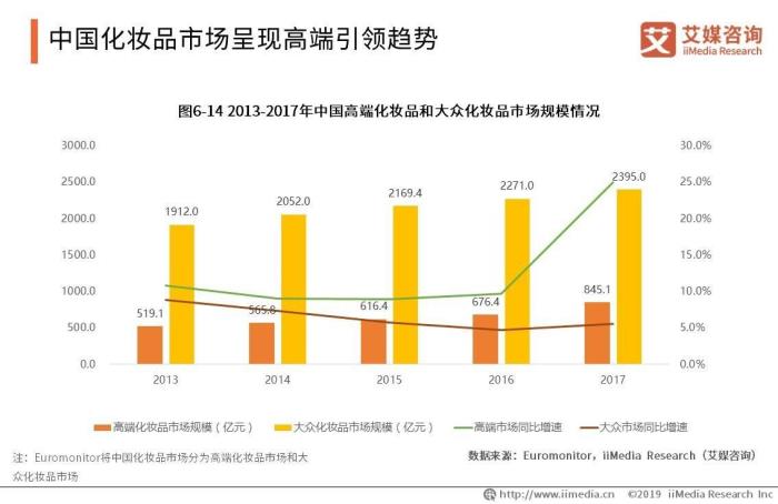 近年来,随着中国经济的快速增长,中国化妆品消费也迅速崛起。iiMedia Research(艾媒咨询)数据显示,2013年中国超越日本成为世界第二大化妆品消费国,2017年中国化妆品的市场规模已占到全球市场的11.5%,仅次于美国的18.5%。
