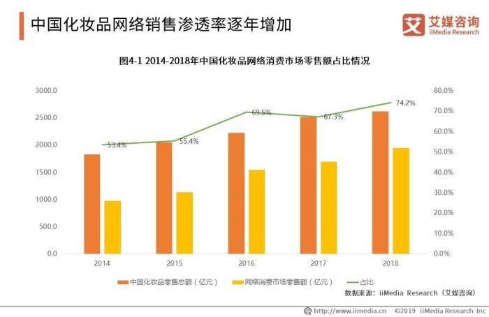 数据显示,中国化妆品网络零售额占比逐步上升,2018年占零售总额 74.2%。电商营销已经成为互联网发展时期中国产品销售的主要渠道。在网络销售模式普及及“美妆达人”、“美妆推荐”直播、短视频、图文等的影响下,化妆品网络销售也逐渐获得消费者的认可。
