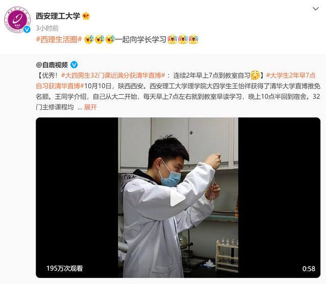 随后,西安理工大学官方微博转发了该视频,号召大家向优秀学长学习。