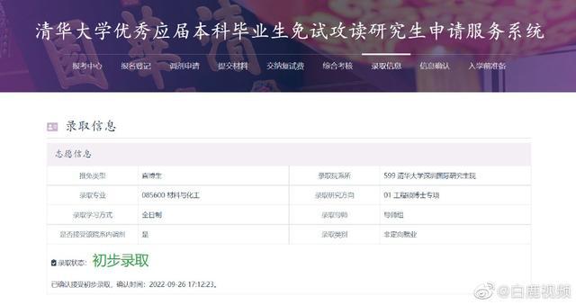 据白鹿视频报道,10 月 10 日,在陕西西安,西安理工大学理学院的大四学生王怡祥获得了清华大学直博推免名额。